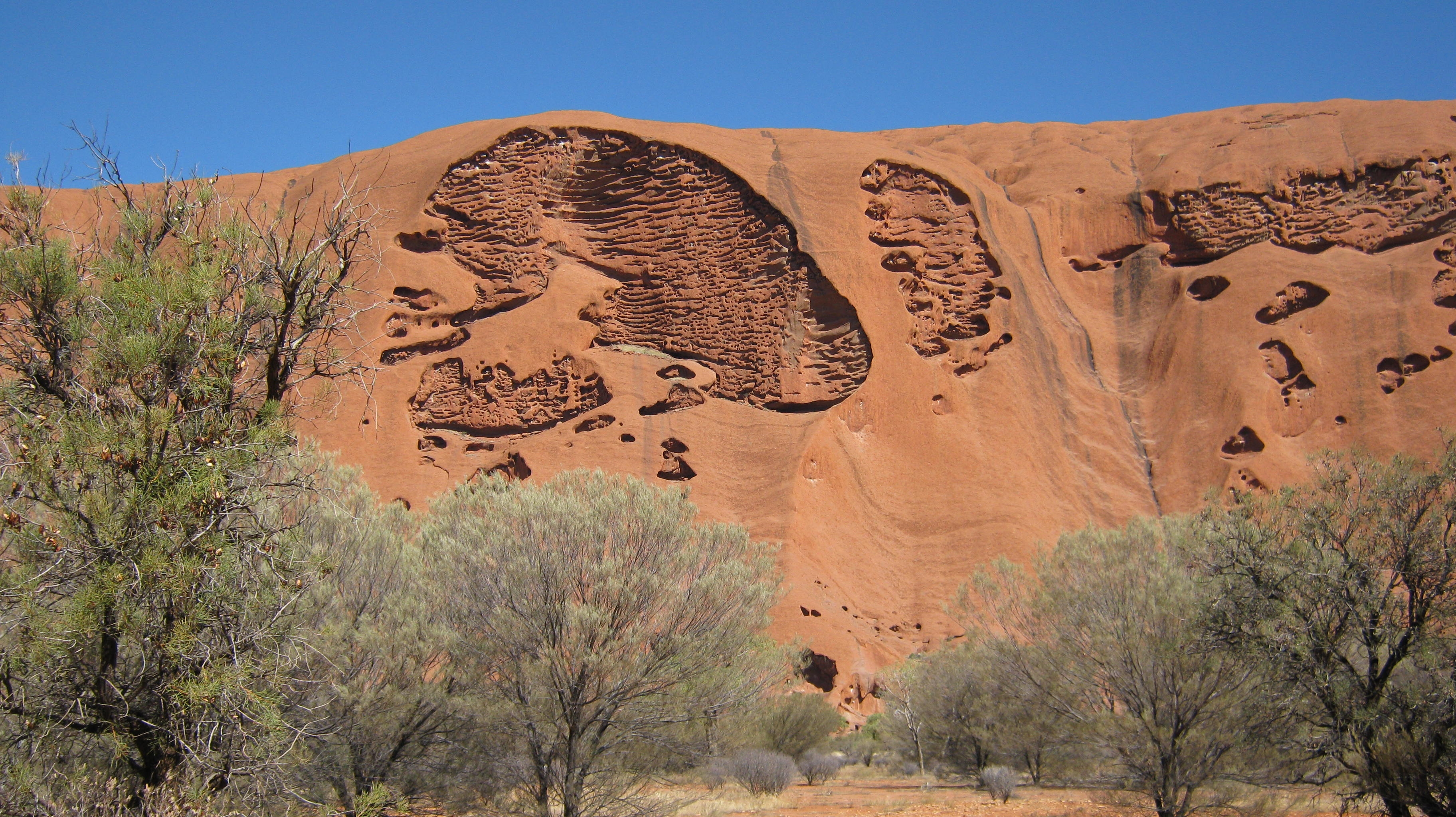 Uluru, an iron-rich sandstone monolith arising from the heart of Australia, is sacred to the indigenous traditional owners, the Anangu. It tells their stories, it shows the actions of the Spirit Ancestors in their violent conflicts during the Dreamtime, displaying evidence of their falls, their spear-thrusts, their lost shields. Uluru itself has a strong, brooding presence, which you begin to feel as soon as you see it, and which grows as you approach and gaze.