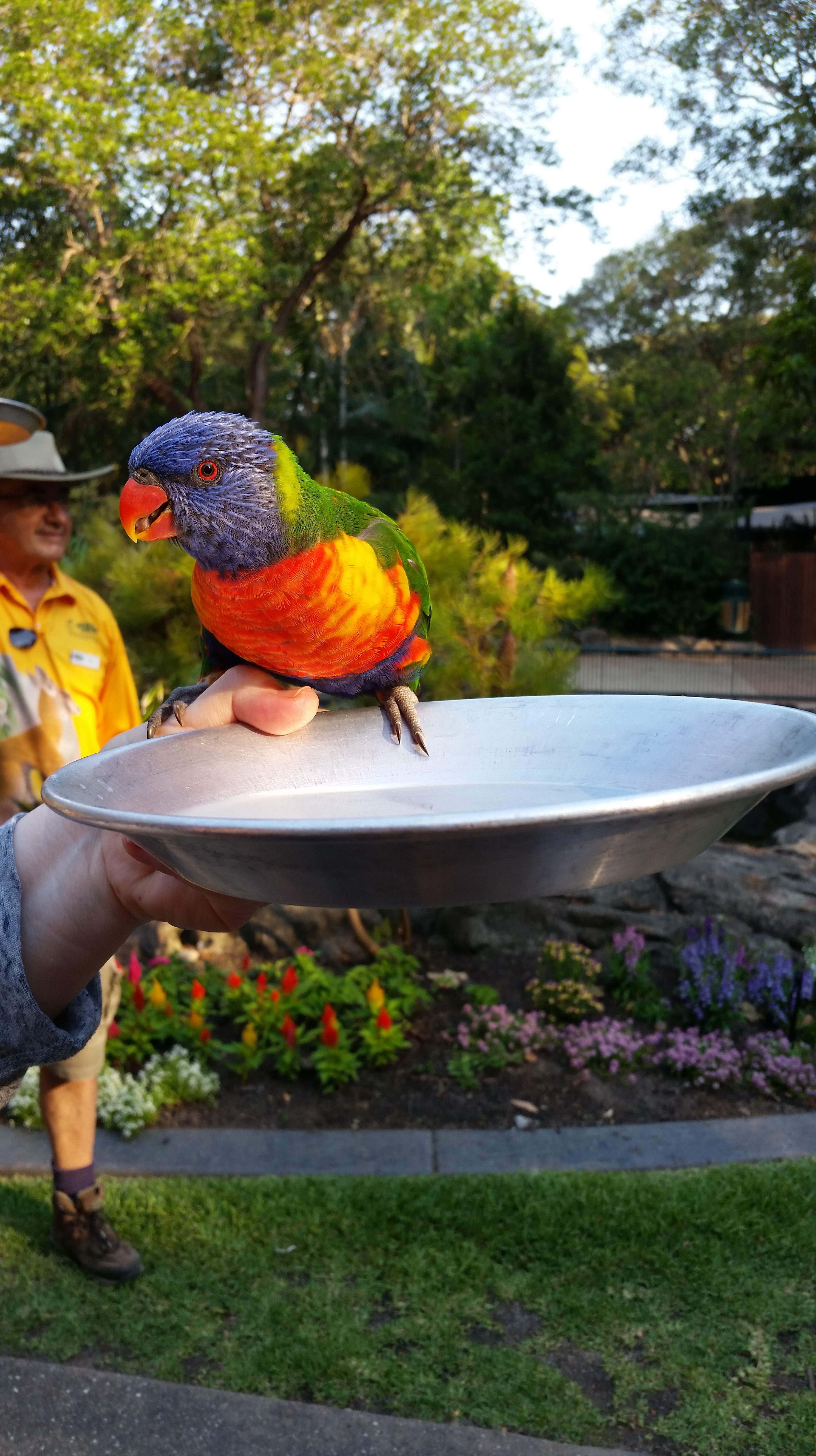 The sanctuary is famous for its lorikeet feeding opportunity, and on my past visits here I’ve experienced thousands of these exquisite birds swooping down to feed from the dishes of honey held by visitors. Sadly, on this occasion, we noticed a much smaller number of lorikeets; whatever the reasons for this, we felt sad to see the reduction in numbers.