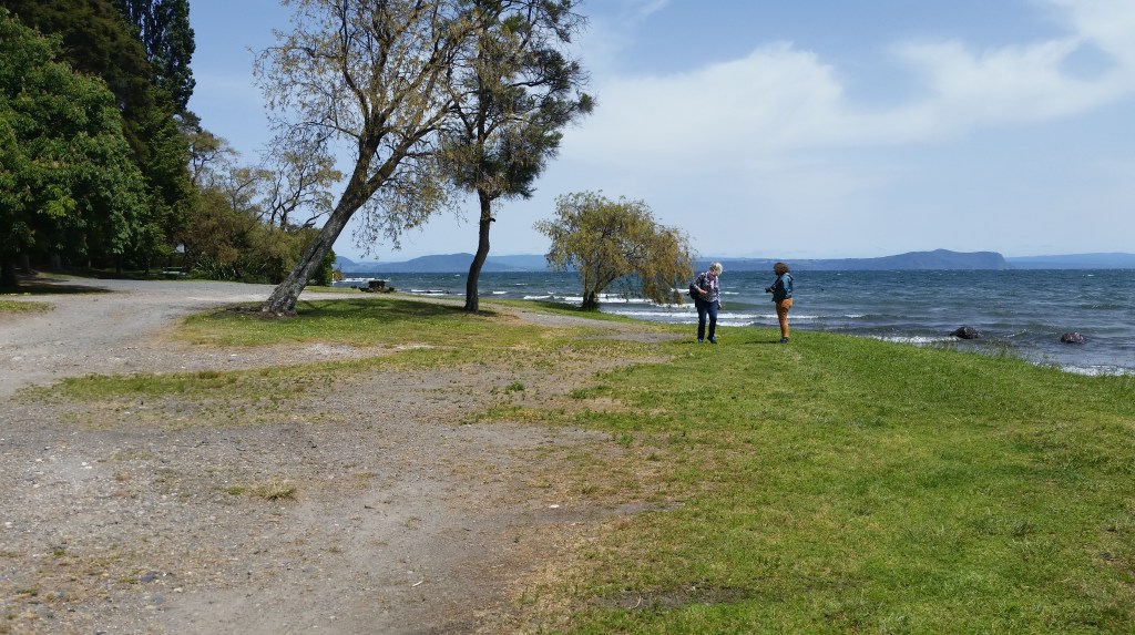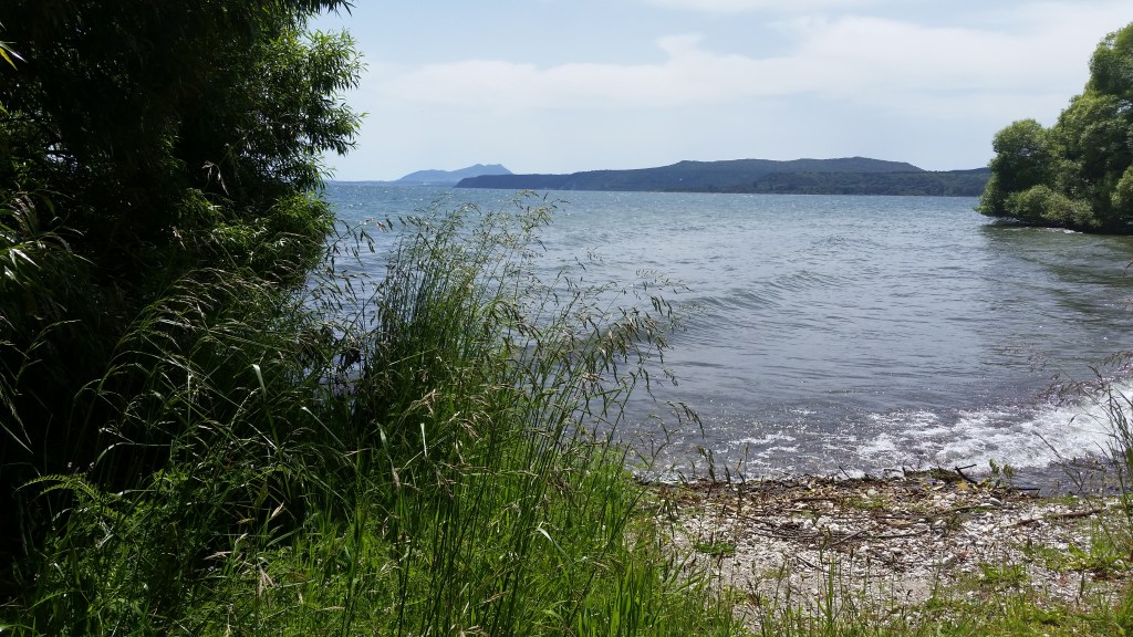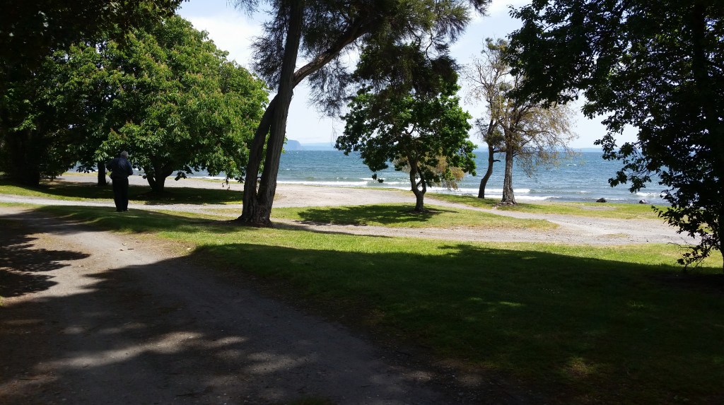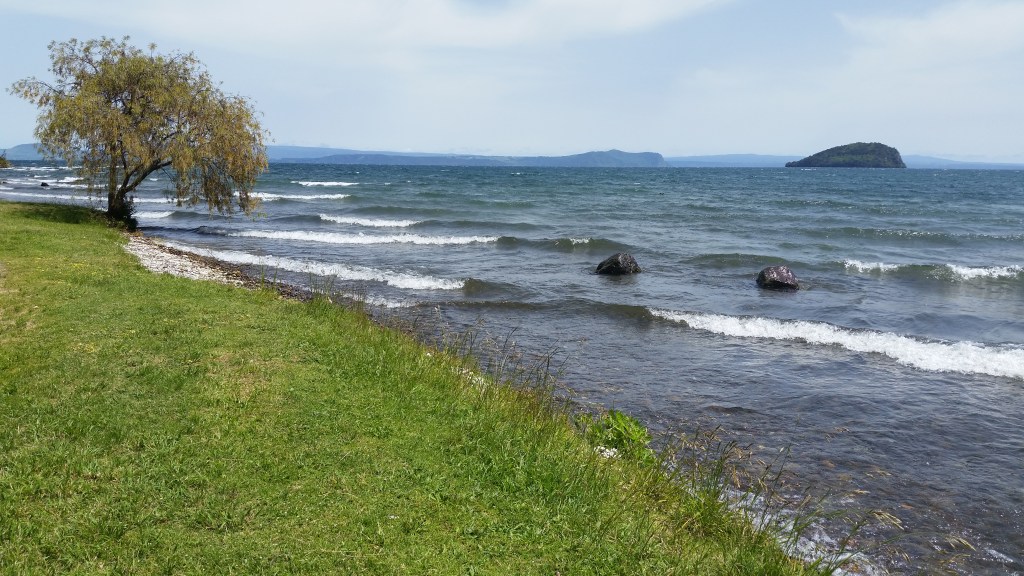 We reached Lake Taupo, sparkling and dynamic, waves washing over black volcanic sand.