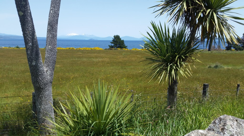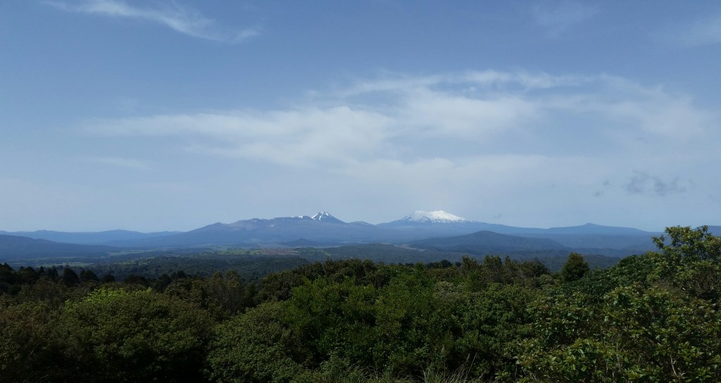 85 kilometres from Lake Taupo, we reached Waituhi Lookout, and walked up to view the sublime vista in which we could clearly see a distant snow-covered extinct volcano.