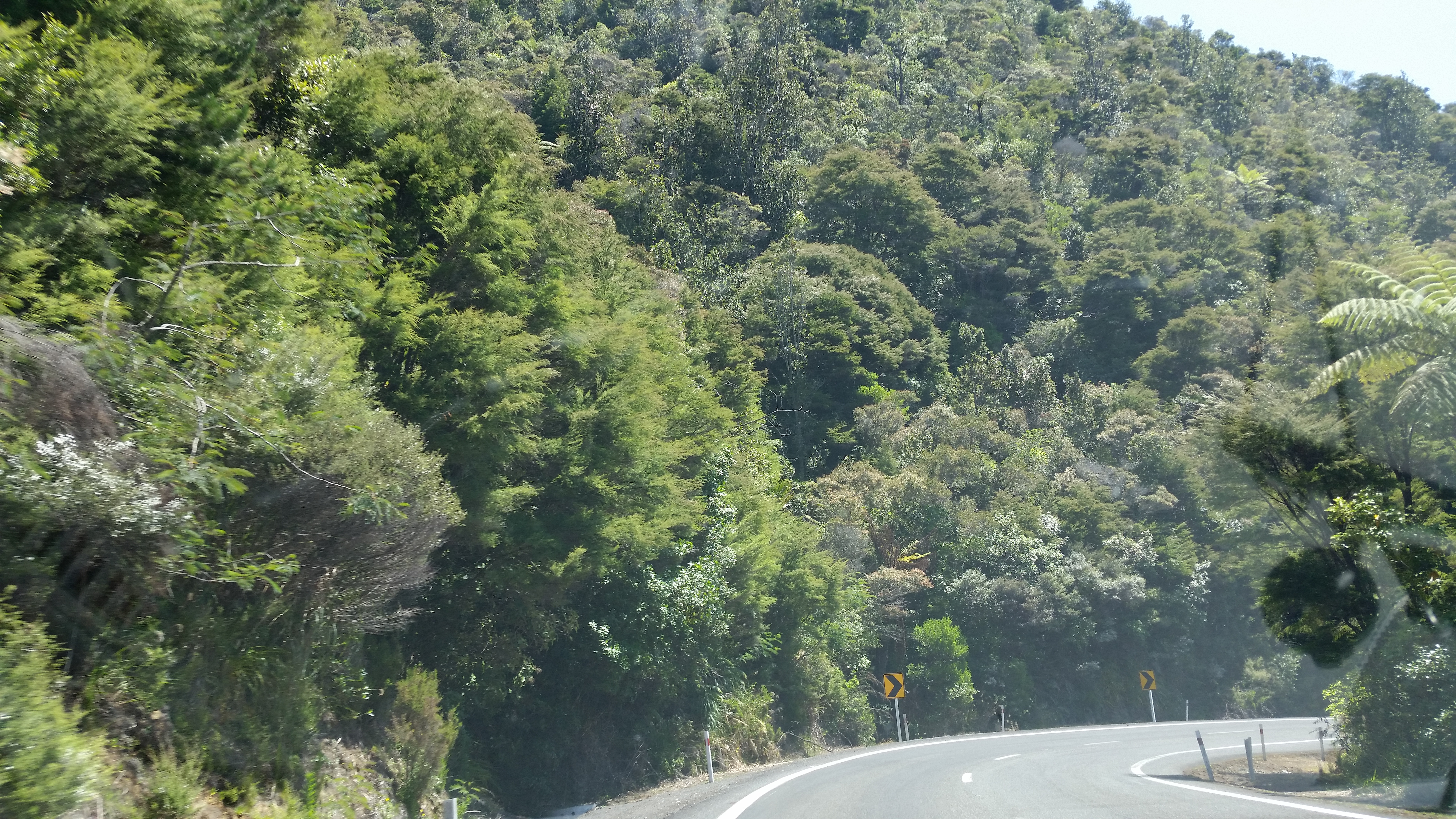 We continued on our journey, which took us through richly forested mountains and between deep cuttings filled with diverse trees interspersed with giant tree ferns, the blue shape of further mountain ranges ahead of us. We stopped off at Whangamata to enjoy its picturesque harbour opening out into the South Pacific.