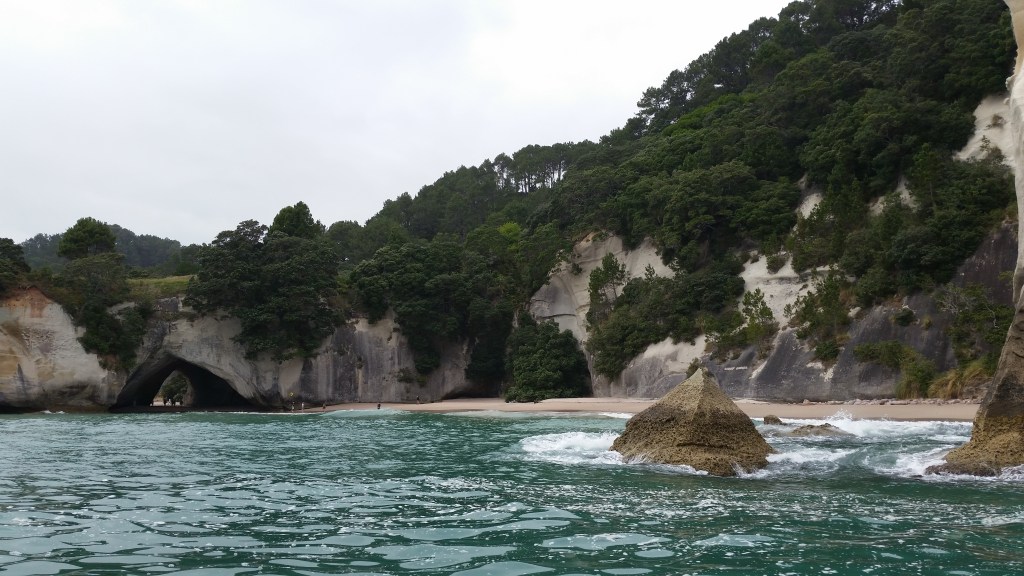 We cruised past the glorious Cathedral Cove. A few people stood on the pristine pale gold beach; at the height of the tourist season tourists congregate here in their thousands. So we were very glad to have chosen the earlier boat trip, and to find the beach so empty. We saw kayakers out on the bay as we cruised past.