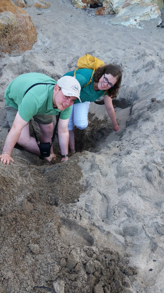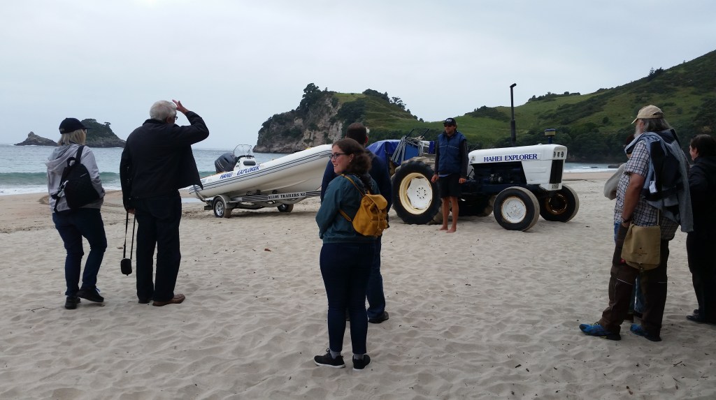 Finally we visited Hot Water Beach, not far from Hahei. There, thermal activity beneath the surface mean that hot water bubbles through the sand – but only in certain areas where several tourist were busy digging so they could sit in the “natural hot tub” when the water rolled in and filled the holes they’d dug. It was very entertaining to watch them; and some of our party did their own digging!