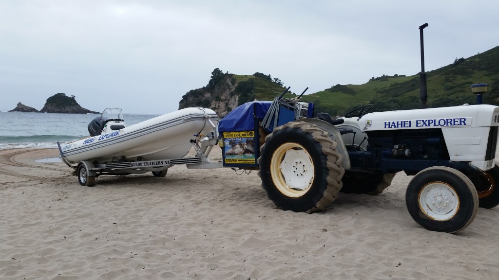 When we returned to Hahei Beach the waves were much more vigorous as they washed onto the sand. As I rose to disembark I was drenched by a large wave, having remained dry throughout the entire boat trip!