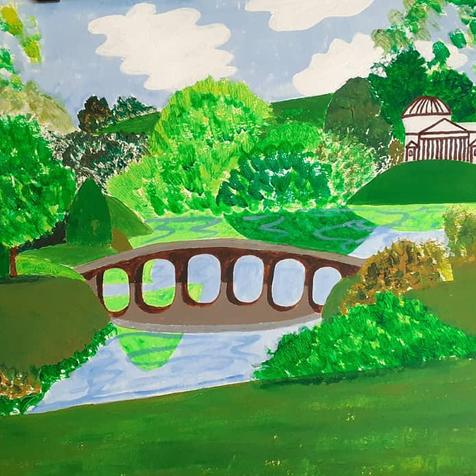 Before visiting the gardens at Stourhead, Wiltshire the other day I looked forward to seeing for myself this ‘living work of art’, for I had created a brightly coloured, stylised copy of a photo of that iconic view just last year, during the first UK lockdown of the Covid-19 pandemic.