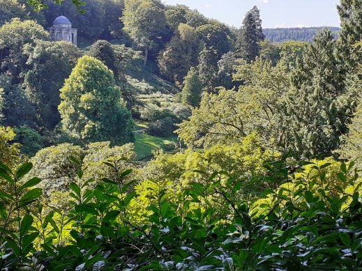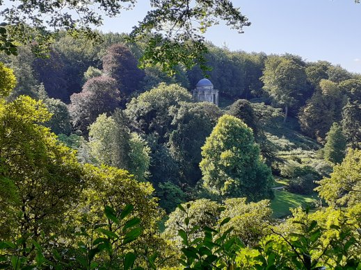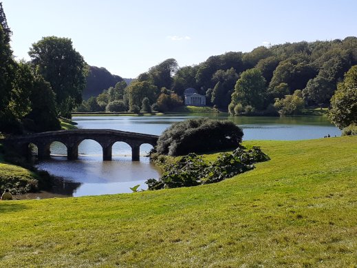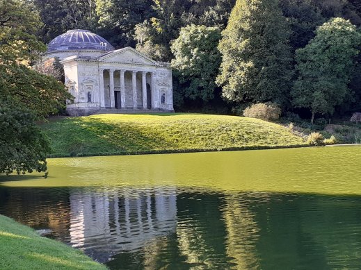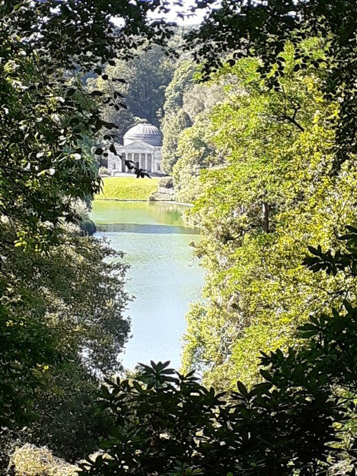Finally, having received glimpses of both the Temple of Apollo and the Pantheon through the carefully selected, planted, cultivated and shaped trees, we came upon the iconic view itself, where you can see the Pantheon across the lake beyond the bridge: