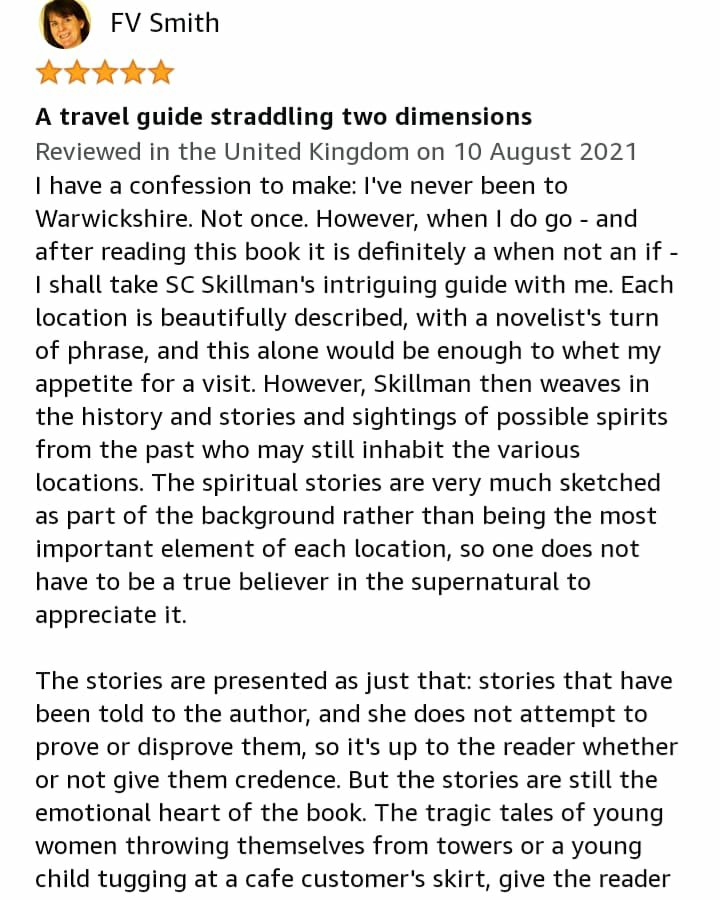 The reader of this book will find that they have two books in one; or three if you include the well chosen quotations from Shakespeare’s plays at the beginning of each section. For SC Skillman has done a great deal of research into each location she discusses, and I found it very interesting to learn of the history of these houses and their owners and occupants as well as the phenomena associated with them.